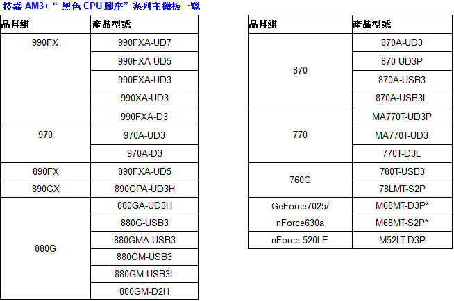 技嘉科技-全球頂尖主機板、顯示卡和硬體解決方案製造商,今日發表最新3.1版的GA-M52LT-D3P、GA-M68MT-D3P及GA-M68MT-S2P 等主機板,支援AMD AM3+ 架構處理器,提供消費者升級AMD FX系列處理器更經濟的選擇。