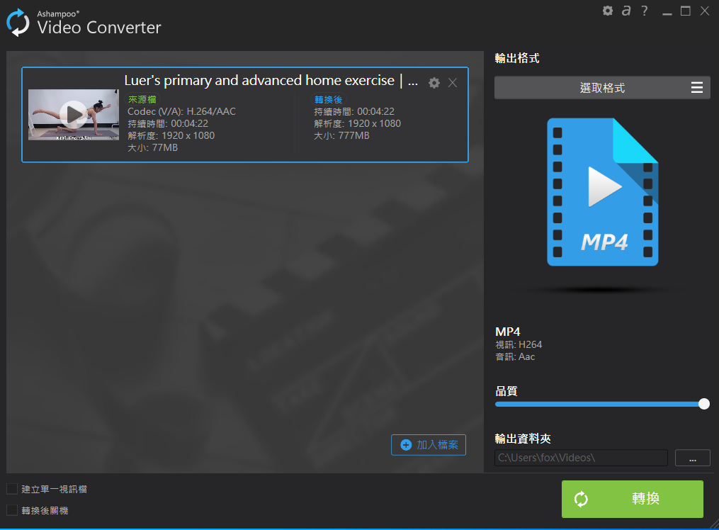 。只需加入您的視訊並選取您想要的輸出格式或目的裝置。然後,點擊「轉換」按鈕,一切