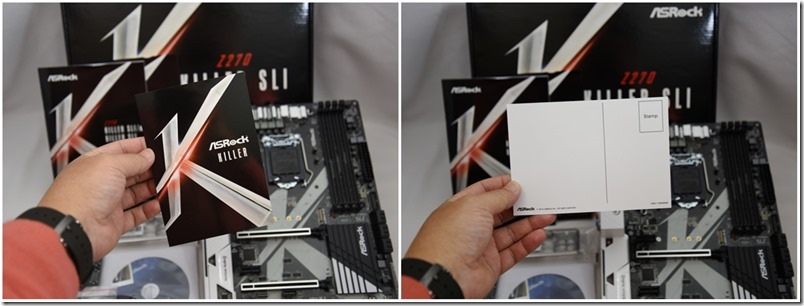 配件齊全的 Z270 Killer SLI 附了一張精緻的小卡,原以為會是重要介面的快速提示卡,或是像是精品產品會附的感謝卡,結果是一張此型主機板專屬的明信片^_^”。