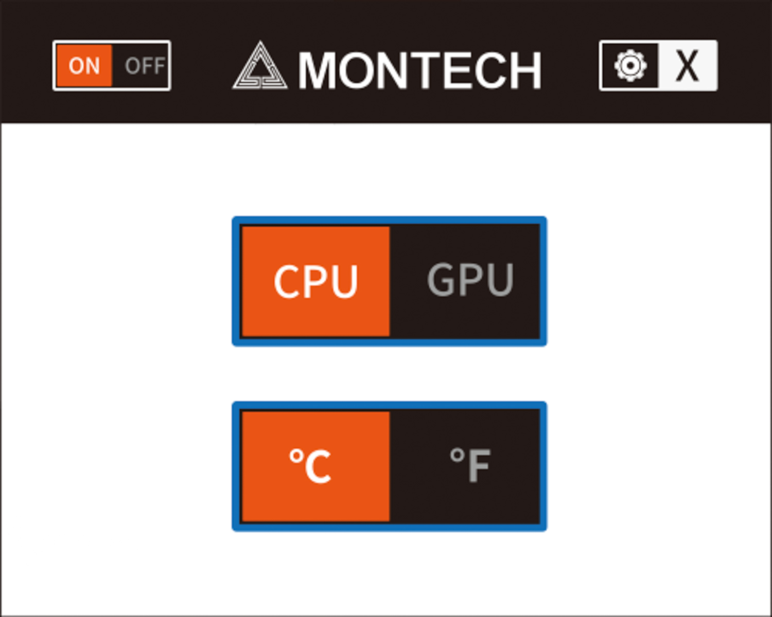 君主 HyperFlow Digital 系列搭載的數位螢幕擁有即時監控功能,將冷頭上的 USB 2.0 9-Pin 連接於主機板上後,搭配 MONTECH 專用軟體進行簡單設定就可以顯示 CPU 或是 GPU 溫度,也可以根據國家使用習慣,切換顯示的溫度單位為 °F 華氏溫度或是 °C 攝氏溫度。