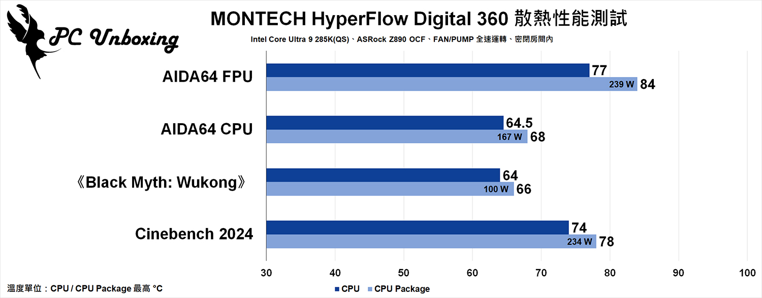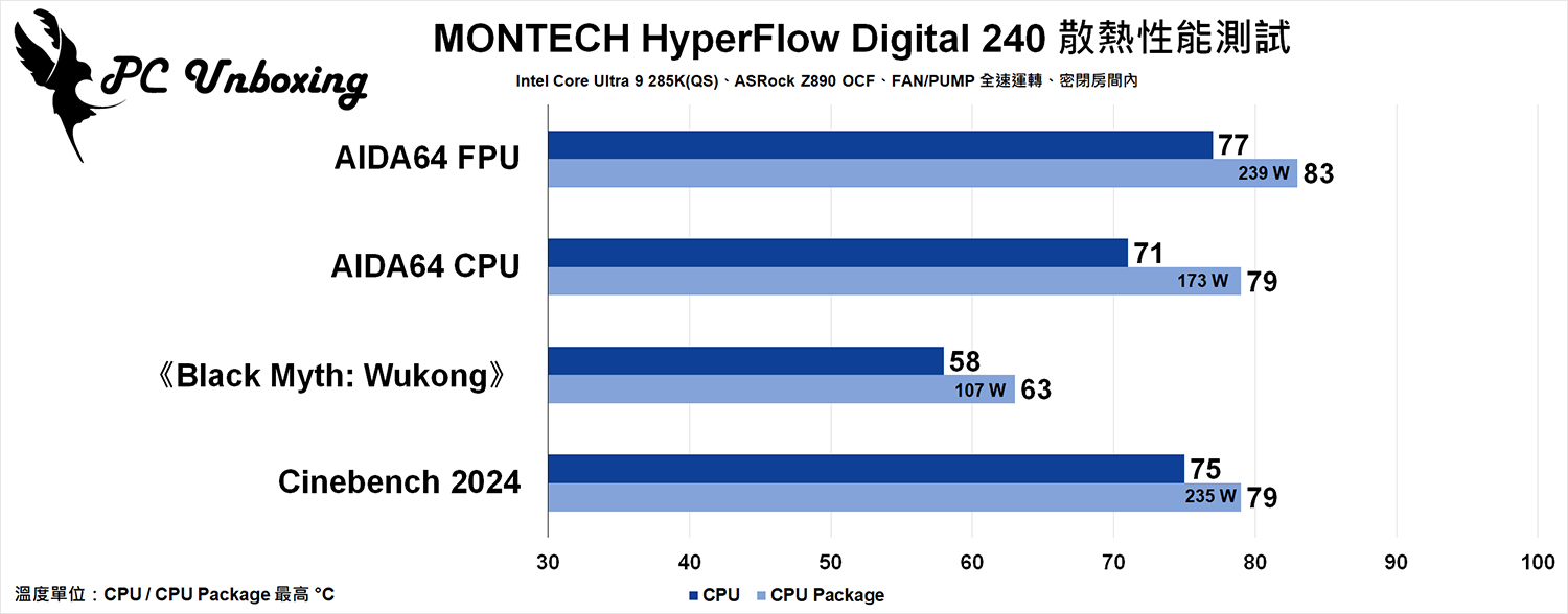 總結來說,君主新的旗艦 MONTECH HyperFlow Digital 360、HyperFlow Digital 240 一體式水冷,在沒有額外開啟處理器超頻功能的情境下,能很有效的壓制 285K 處理器高負載使用情境。