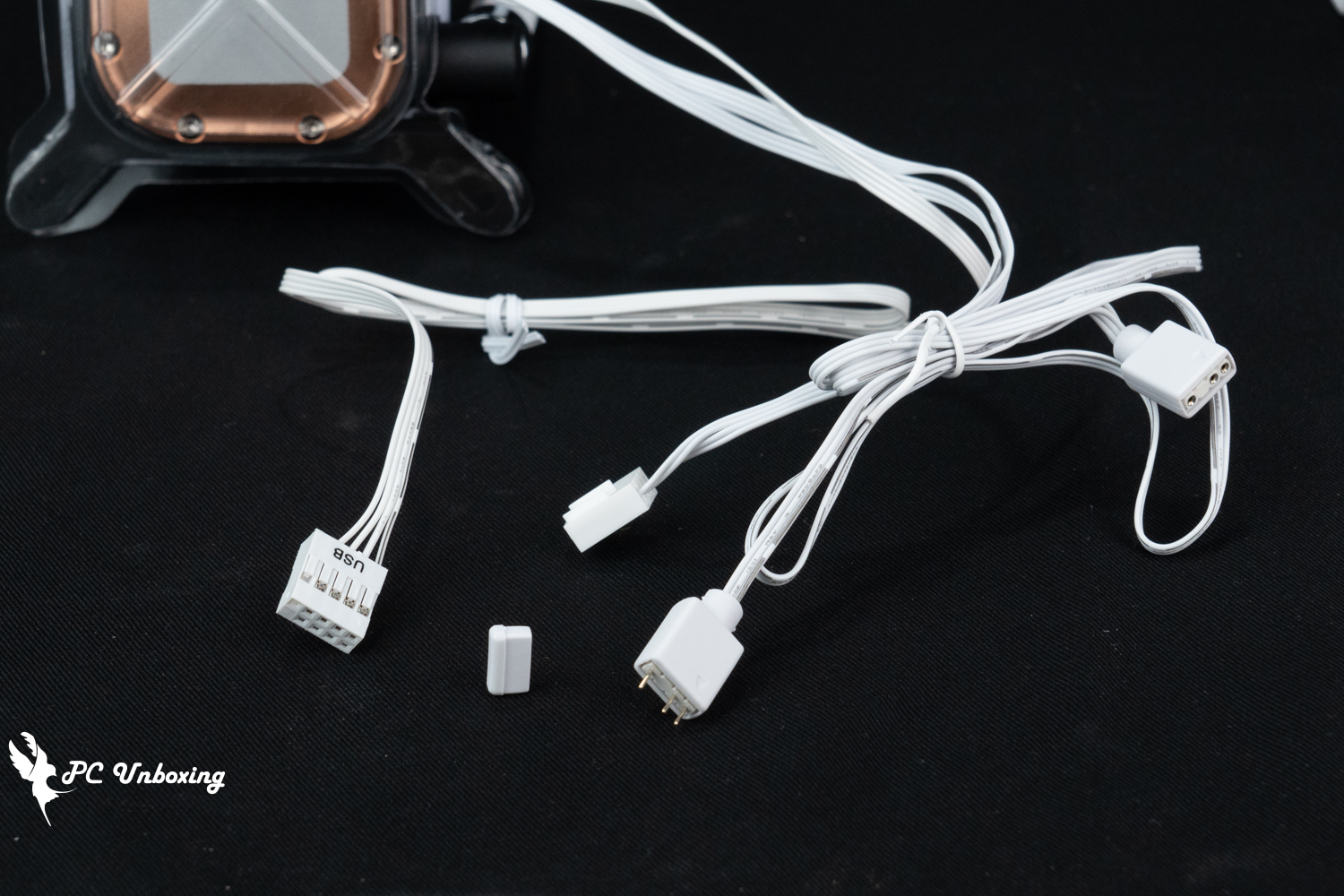 △ 水冷頭提供線材:一公一母 5V 3-Pin ARGB、PWM 4-Pin、USB 2.0 9-Pin。