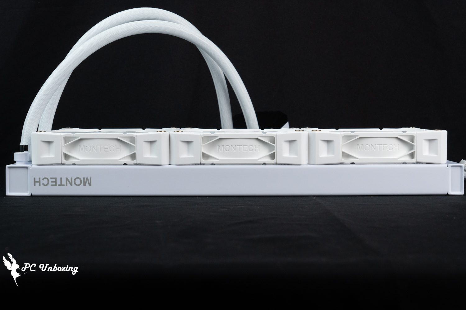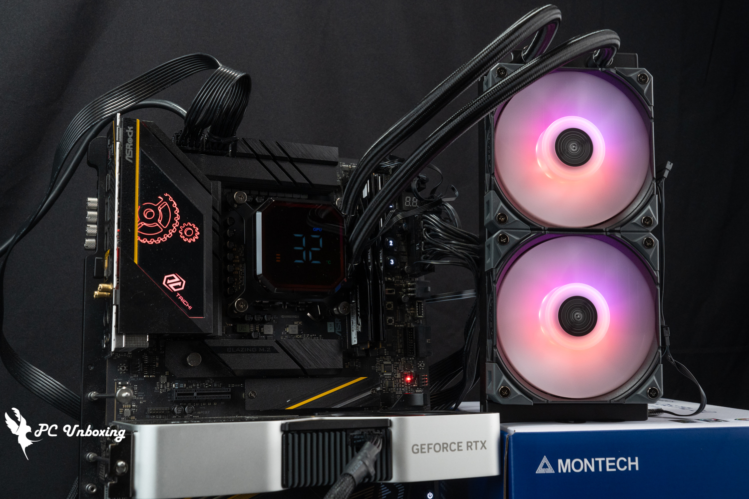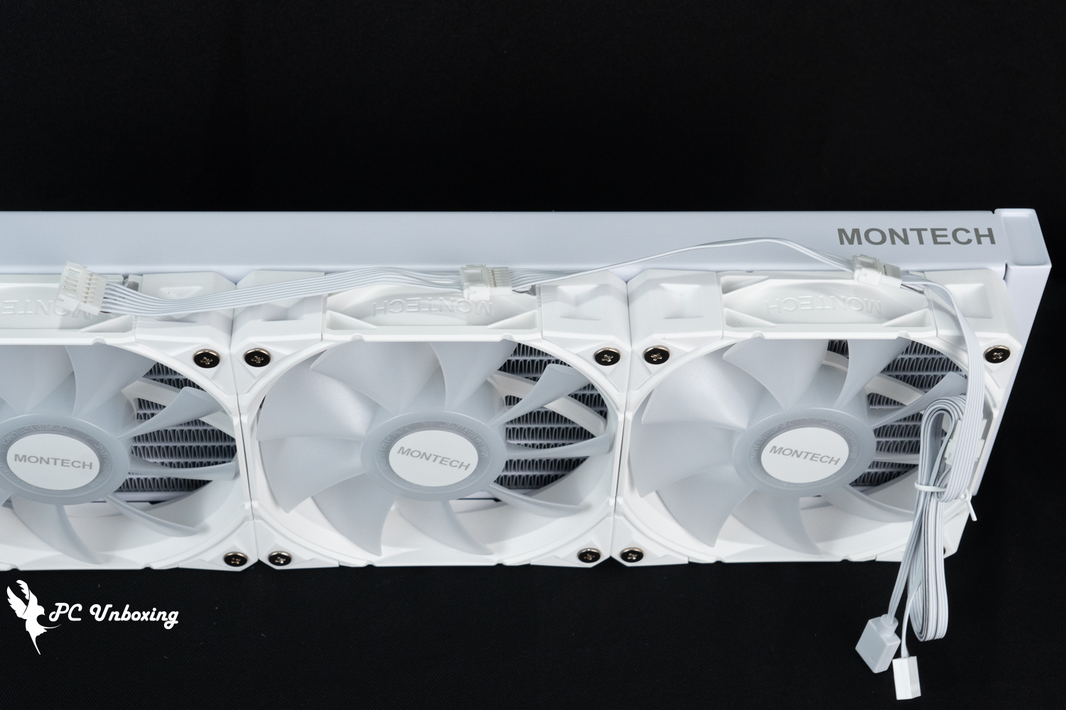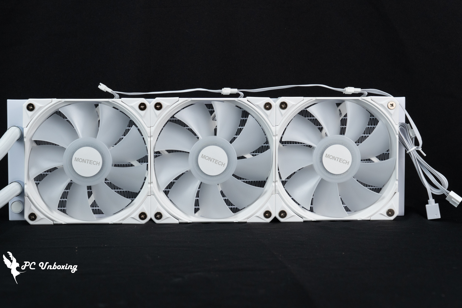 水冷預裝的水冷排風扇為 MONTECH E28 ARGB 風扇,可以在 GIGABYTE、ASRock、ASUS、MSI 等四家主機板軟體內設定個別燈珠的燈光效果,風扇本身尺寸為 120 x 120 x 28 mm,最大轉速可達 2000 RPM ± 10%,標榜最大風量為 85.09 CFM;最大風壓則是 3.35 mmH₂O,最大噪音值標榜為 ≤34.17 dB(A)。