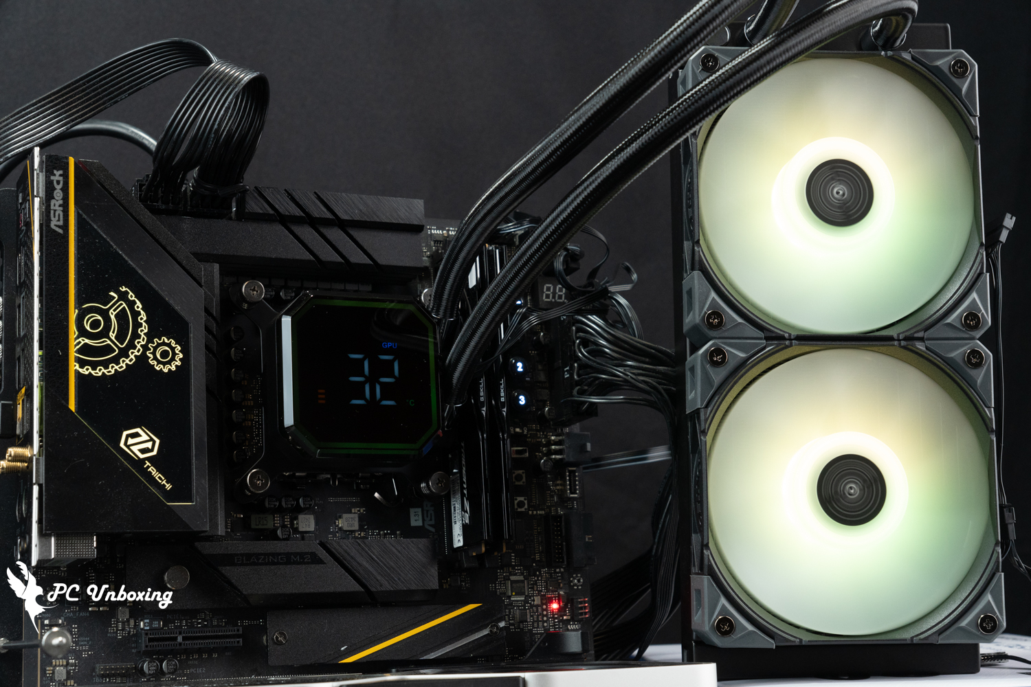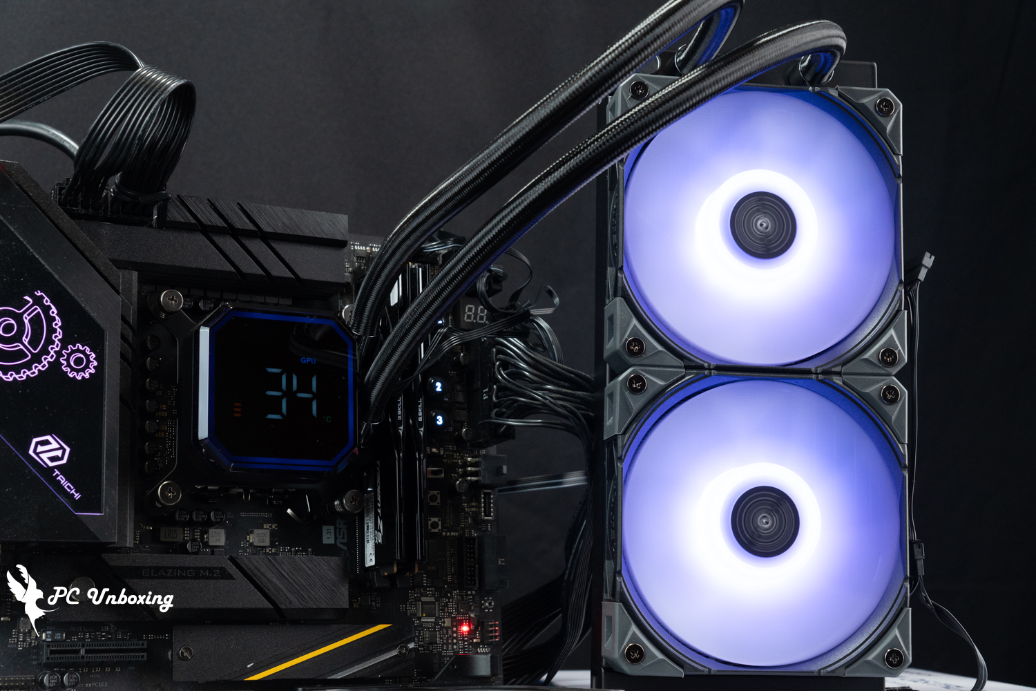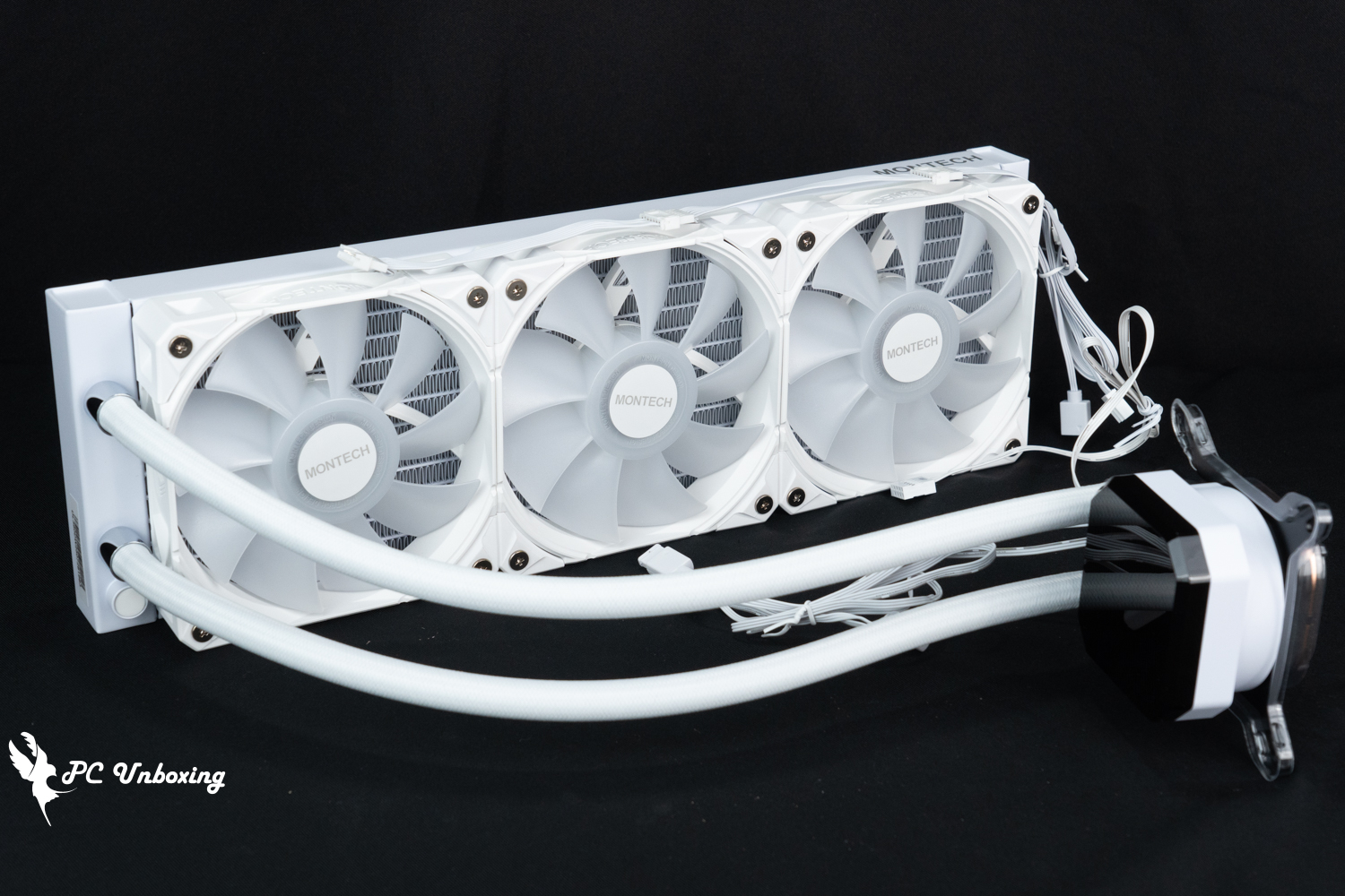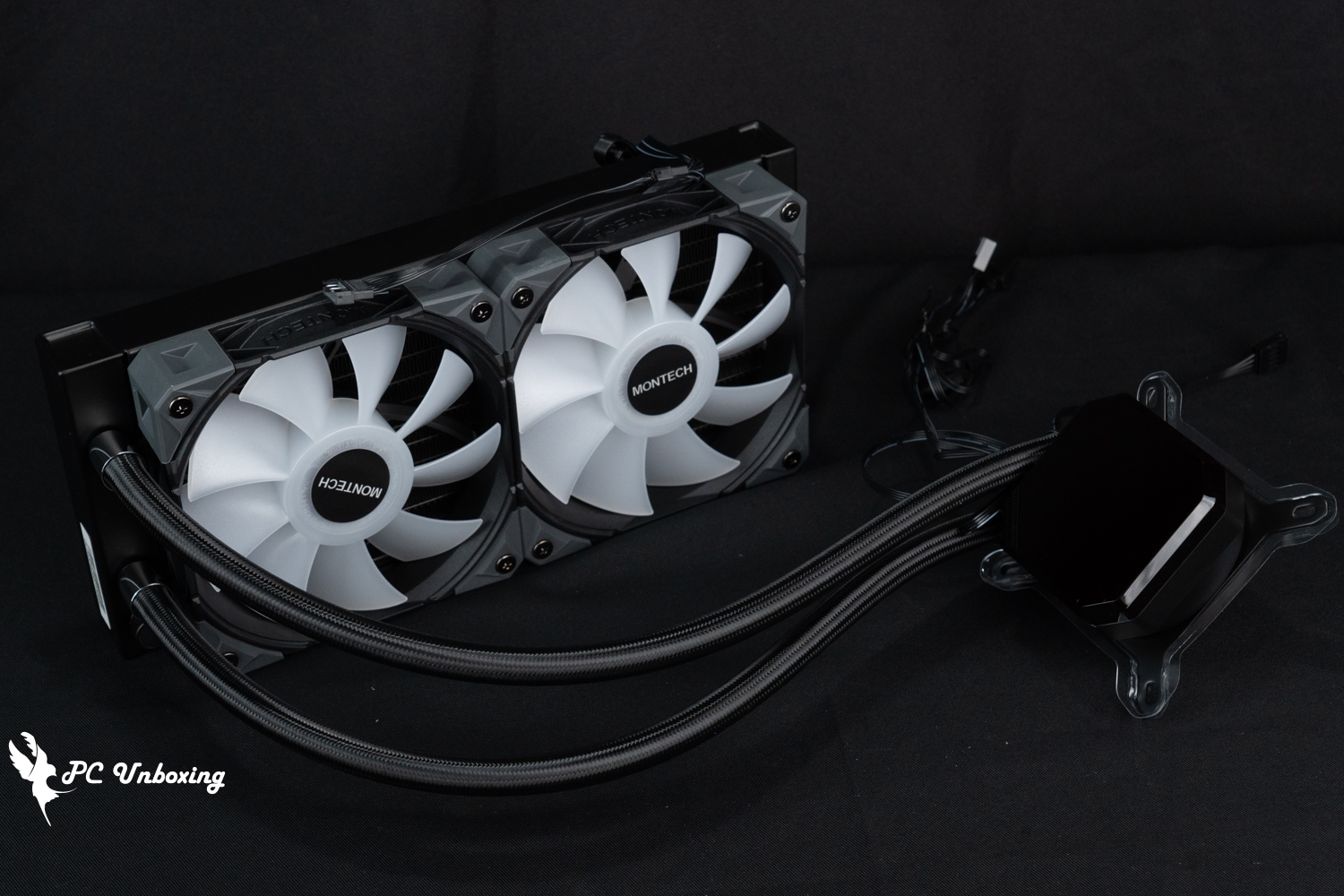 水冷預裝的水冷排風扇為 MONTECH E28 ARGB 風扇,可以在 GIGABYTE、ASRock、ASUS、MSI 等四家主機板軟體內設定個別燈珠的燈光效果,風扇本身尺寸為 120 x 120 x 28 mm,最大轉速可達 2000 RPM ± 10%,標榜最大風量為 85.09 CFM;最大風壓則是 3.35 mmH₂O,最大噪音值標榜為 ≤34.17 dB(A)。