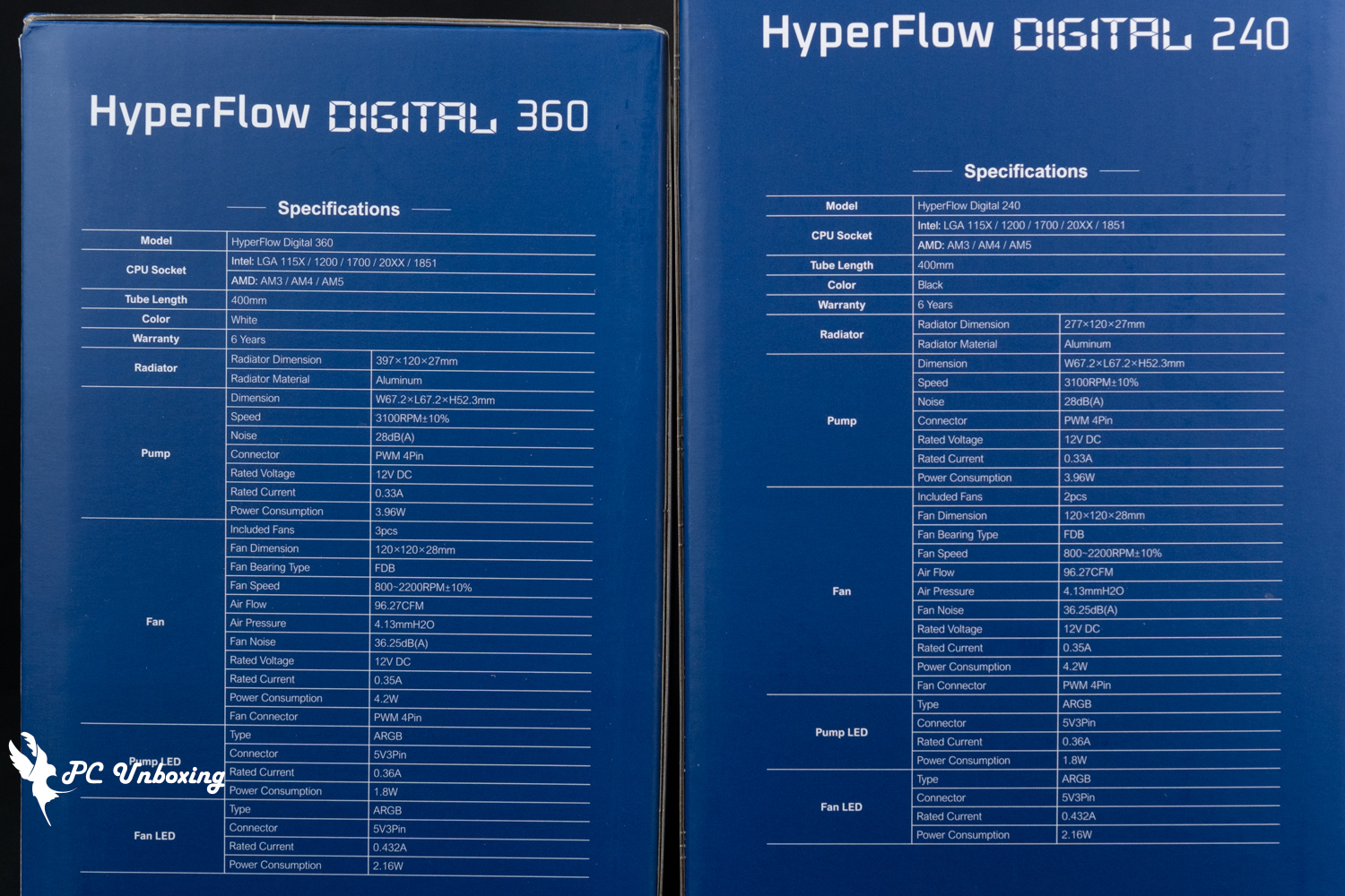 同步推出 360 mm 水冷排的 HyperFlow Digital 360 與 240 mm 水冷排 HyperFlow Digital 240 兩種規格,且各自有黑白雙色總計四種 SKU 可選擇,玩家們可以根據機殼支援的水冷尺寸,抑或是裝機配色想法去做搭配,價格最高的 HyperFlow Digital 360 建議售價依然是三千有找,對於預算有限的消費者來說相對比較不會那麼吃緊。