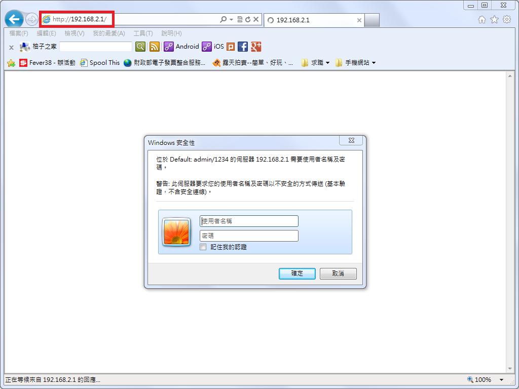 將分享器開關切換到「LAN」,使用網路線連接電腦,開啟瀏覽器在網址輸入「192.168.2.1」之後會跳出認證視窗,請輸入admin/1234。