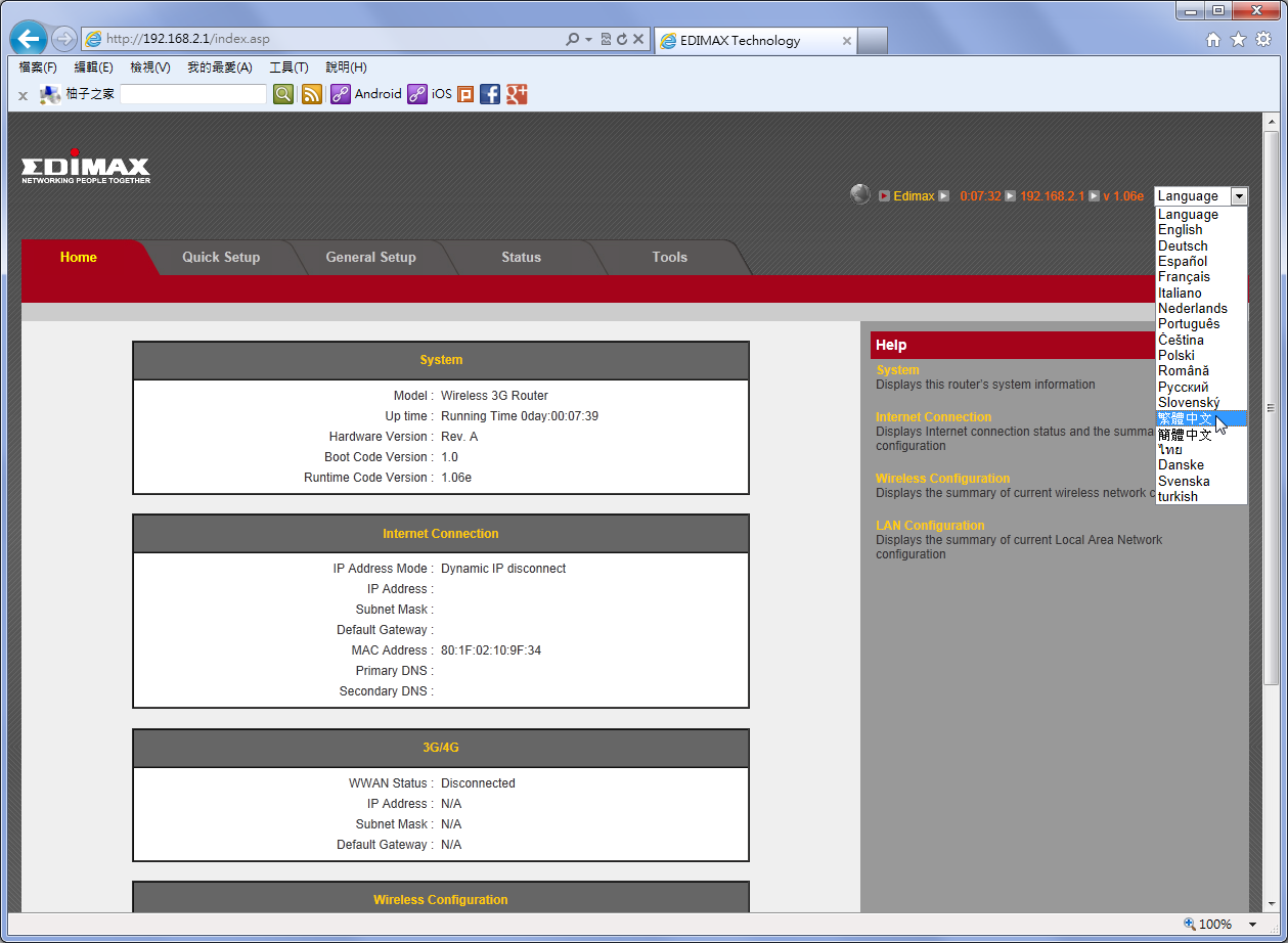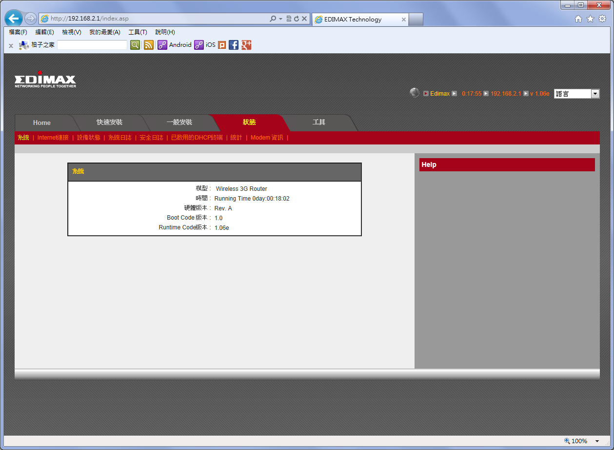 狀態底下的系統部分可以看到機型(翻譯成模型好像怪怪的)、時間、韌體版本等資訊。