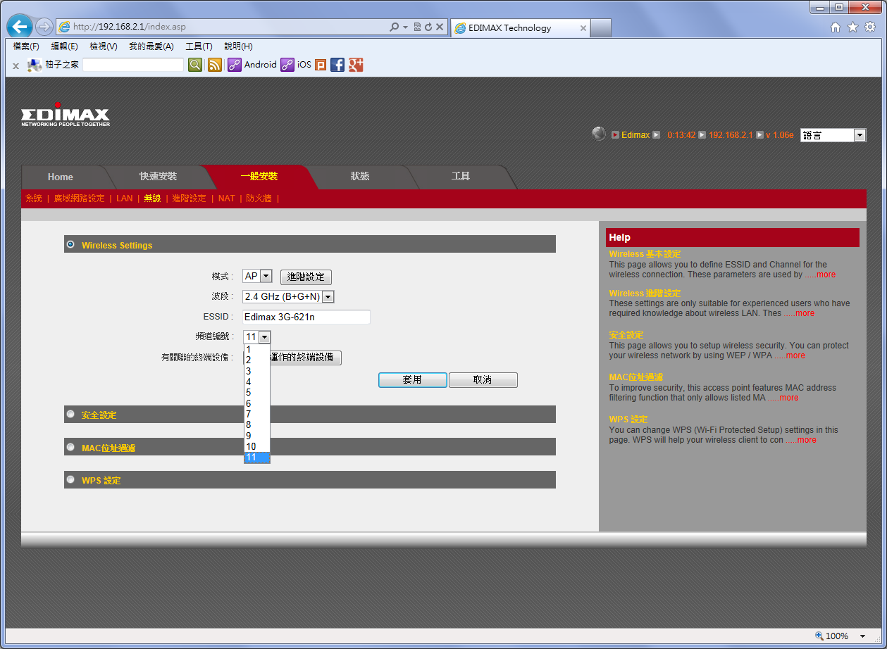 設定無線網路的頻道。設定完畢後按下套用儲存變更。