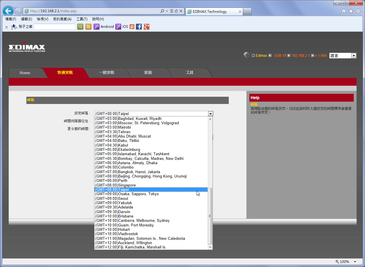 然後點「快速安裝」,設定時區選擇「(GMT+08:00)Taipei」,選擇完成後按「下一個」。