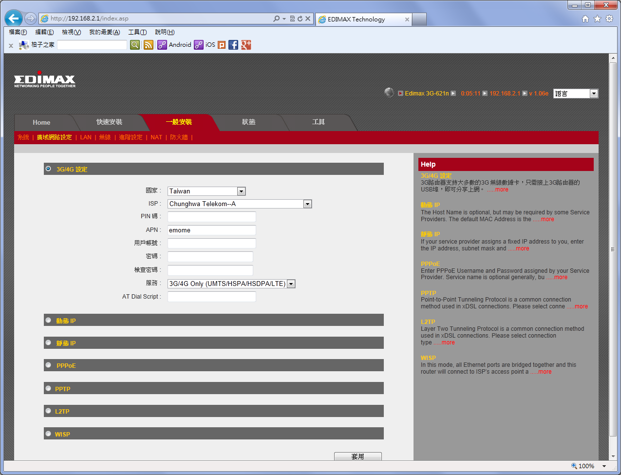 如果要設定3G網卡則到一般安裝底下的「廣域網路設定」,選擇國家、3G電信服務商,APN一般設定為Internet。(如果電信商選擇中華預設會是emome)