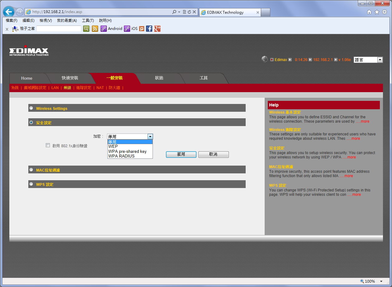剛剛只設定了無線網路,但是還沒有加密,這會讓無線網路被盜連,所以在安全設定的部分選擇加密方式,不過要注意手上設備是否支援較新的加密方式。