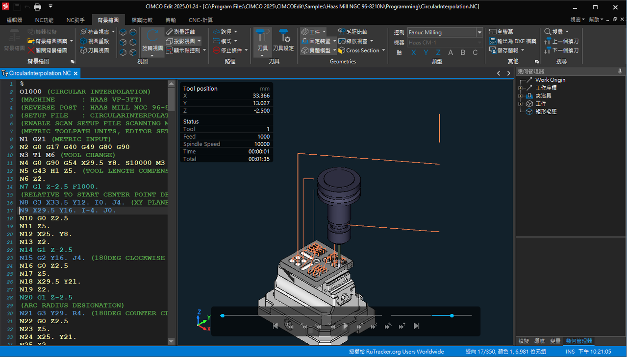1. 完整的程式編輯:動態調整進給與轉速、刀具路徑統計、建立刀具清單、程式平移