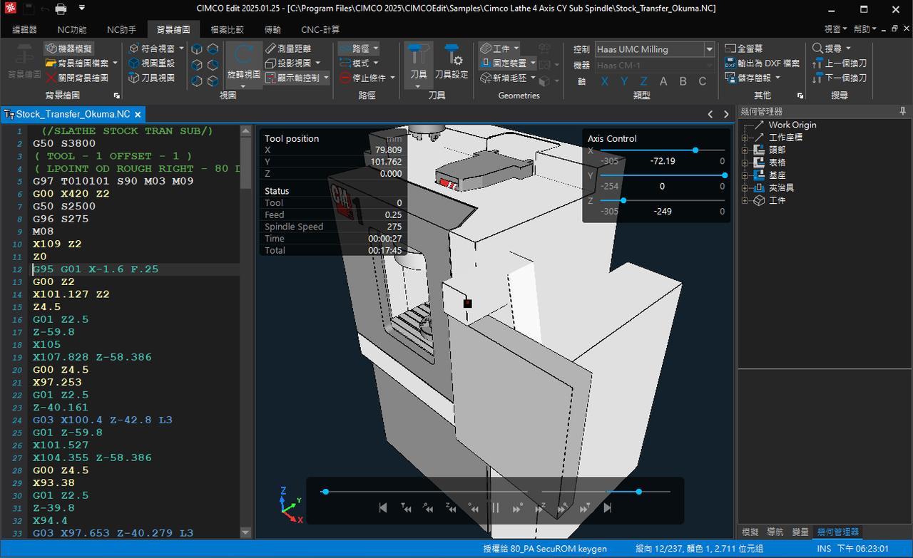 3. 提供車床2軸/銑床3軸刀具路徑模擬功能,支援Mazatrol files、Hass G Codes…