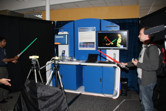 這是會場人氣最高的攤位,利用兩具 3D 攝影機捕捉兩位使用者的動作,並即時合成 3D 互動影像在螢幕上。