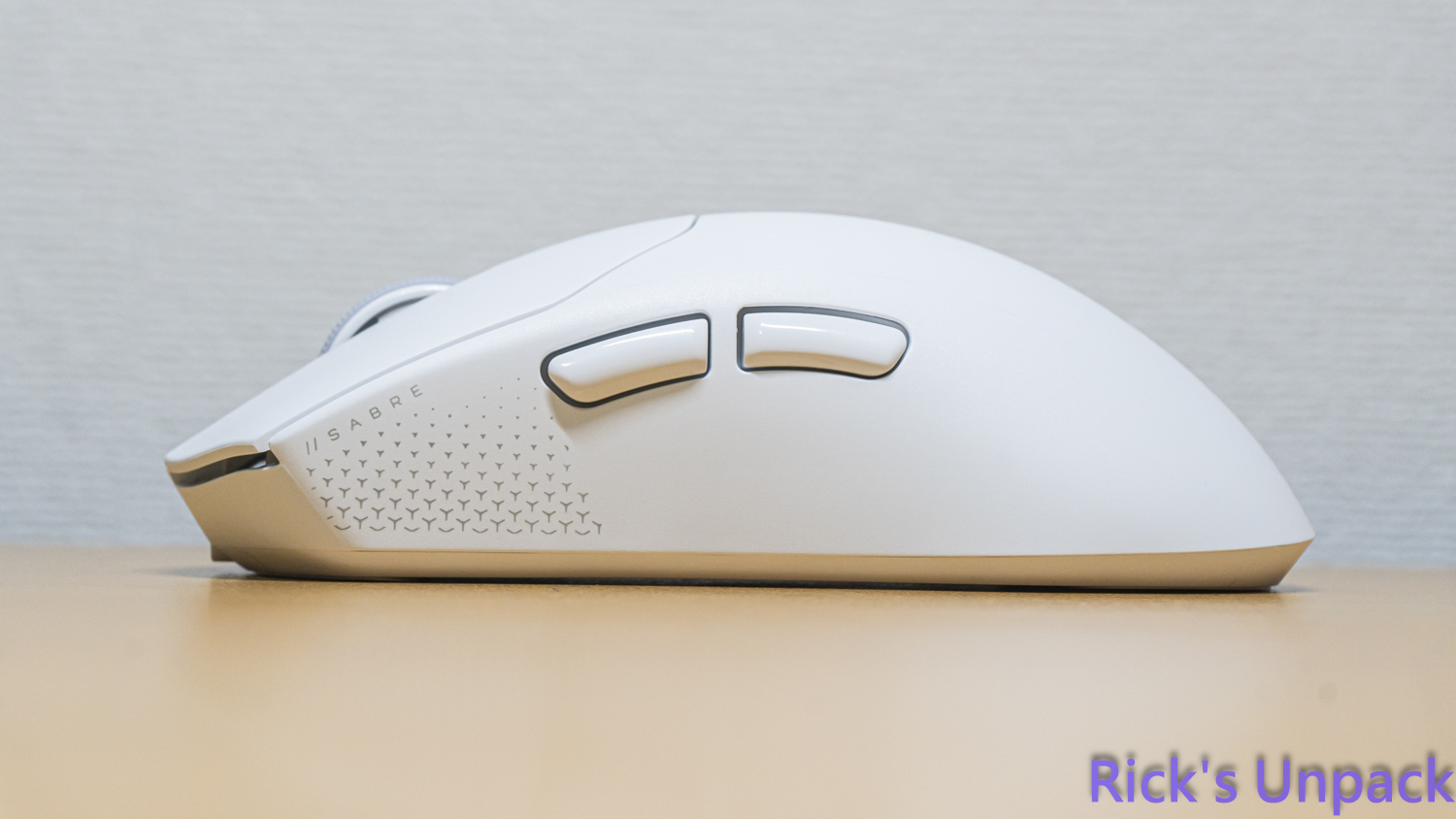 SABRE V2 PRO本身是對稱鼠設計,在左右兩側中間都有稍微的收腰設計,不過在正常握法下對大拇指或小拇指下方的手掌肌肉不會有不舒服的頂手感,整體曲線設計上算溫和,對於抓握或抓趴握都有不錯的提手效果。