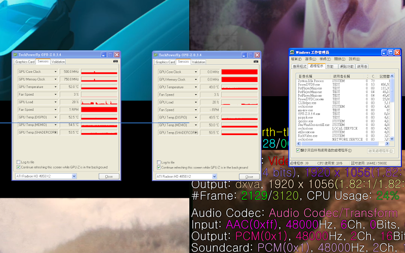 johnnyliu3377 說: ;nq; 能雙解AVC1+1嘛?就是兩個個別影片檔案,分別用播放PotPlayer & Power DVD播出 看看雙GPU分流硬解與CPU的佔用率.....:D 按一下展開…… 看來PotPlayer不能滿足強尼大 那我抓個圖來看看好了 PowerDVD跟PotPlayer三刀流的GPU與CPU使用率 開心的抓完四個1080p的高清影片同時播放圖之後發現,奇怪~~好像只有兩個影片有得到加速,仔細端詳之後發現真的是這樣,無論是PotPlayer還是PowerDVD,先搶先贏,先開檔案的可以硬解,打破了我對GPU可以分時運算的假設,原來硬解不像繪圖程式可以同時擁有GPU的資源,不過以PotPlayer和PowerDVD同時各解一解AVC1看來是沒有問題,用兩個PotPlayer解兩隻AVC1當然也是OK的啦,要不是強尼大提出這個問題,我也不會發現這個事(還是本來就是這樣,只是我不知道而已XD)。 補一下測試平台 CPU:Core i7 965 3.2GHz 主機板:MSI X58 Eclipse 記憶體: DDR3 1.333Ghz 2GB * 3 作業系統:Windows XP SP3 32-bit
