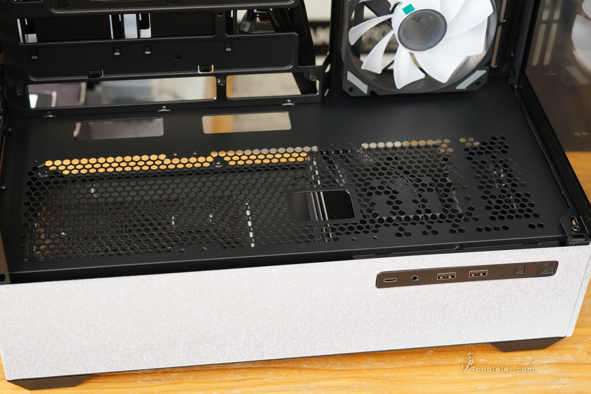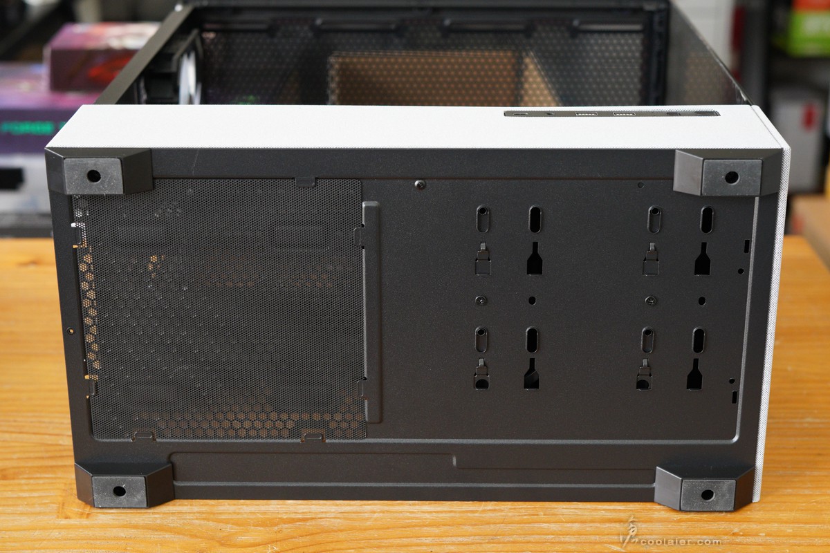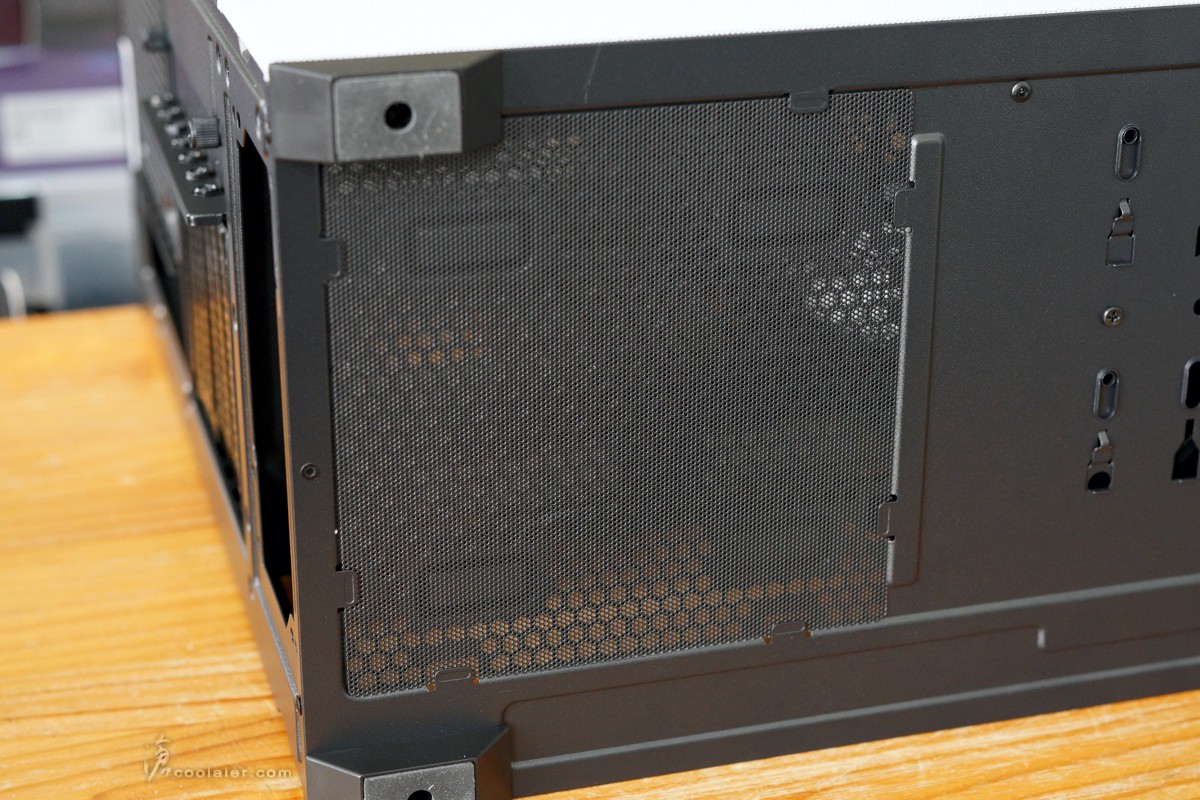 側身進風設計,所以右側板在相應位置上也開了通風孔。因採用較細格狀開孔的關係,內部並無濾網。