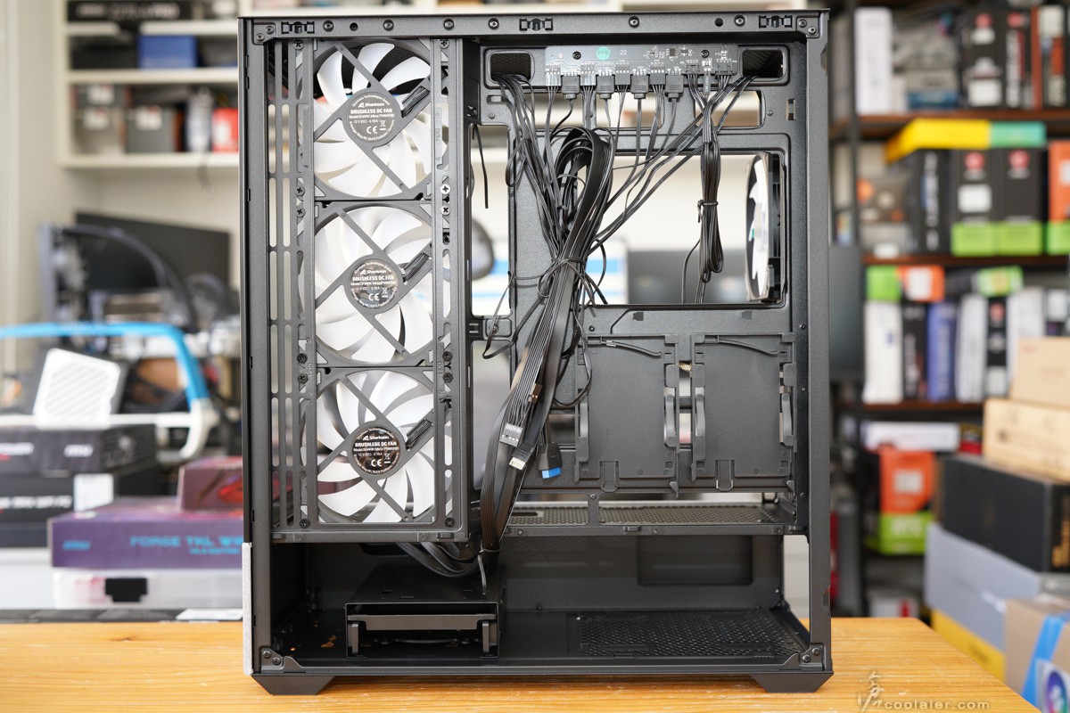 背部,上方有燈效控制器兼風扇集線器,下方為電源與硬碟安裝位。