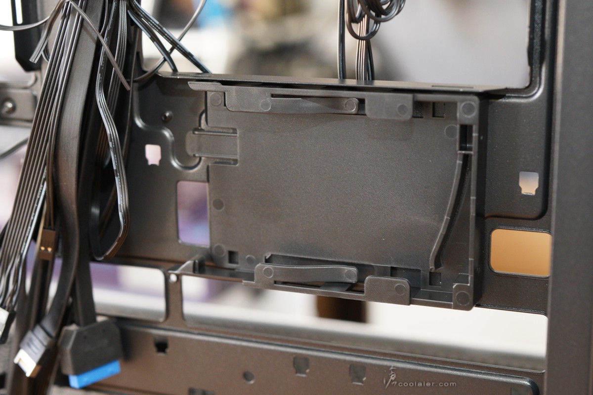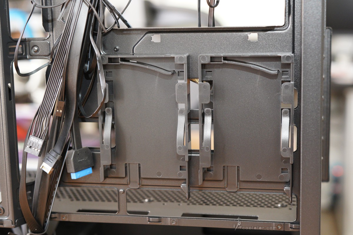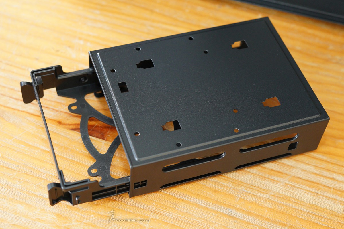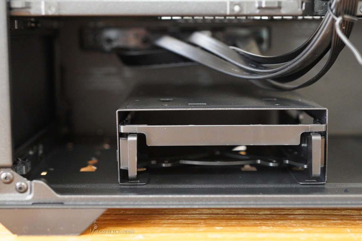 3.5吋硬碟架在機殼底部有兩顆螺絲固定。硬碟架頂部可以安裝1顆3.5吋或2.5吋。