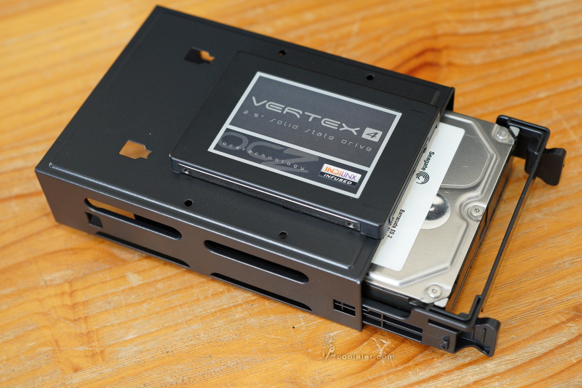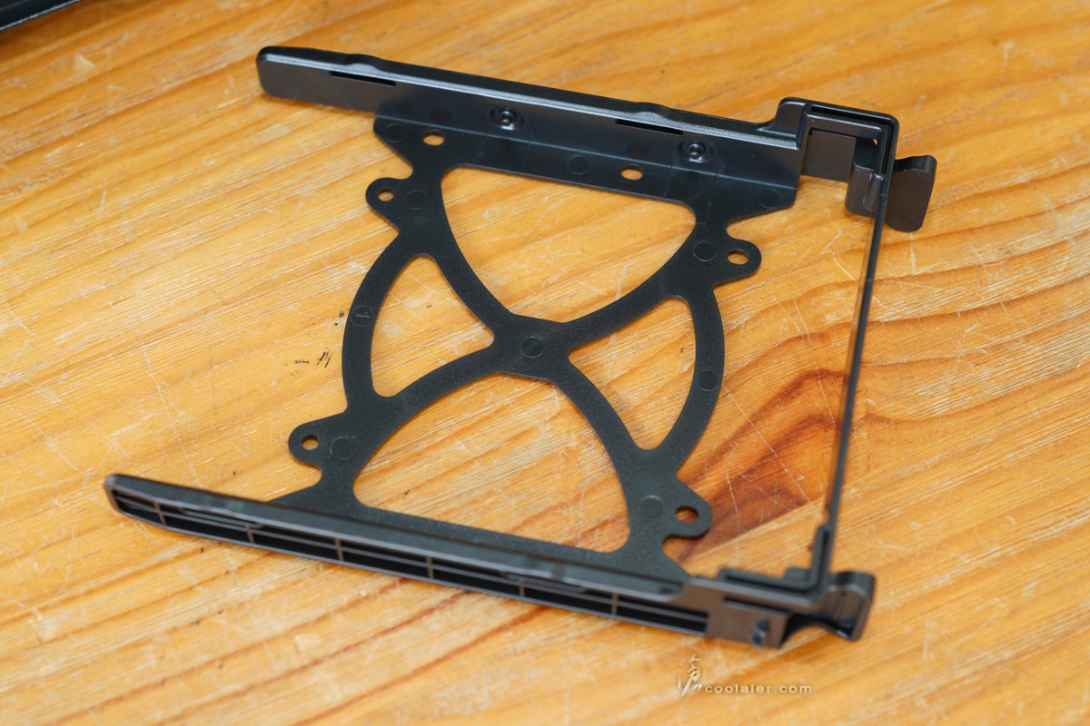 內部為硬碟托盤,兩側按壓即可抽出,除了安裝3.5吋硬碟之外,底部也有2.5吋硬碟的安裝孔。