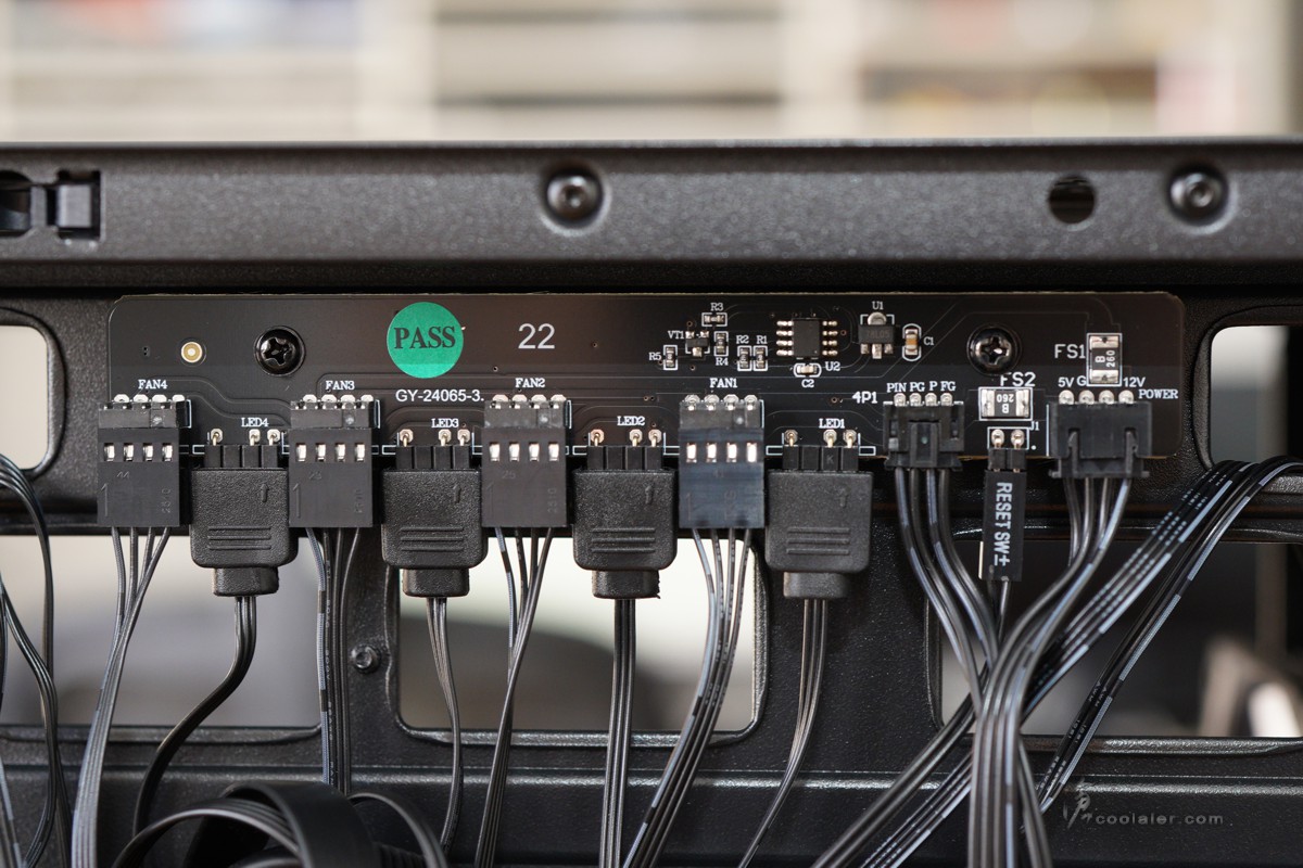 燈效控制器兼風扇集線器,四組風扇燈效都已經插在上面,也並無另外插孔支援其他裝置同步。控制器需要連接 SATA 電源,另也有風扇與燈效接線可連至主板。