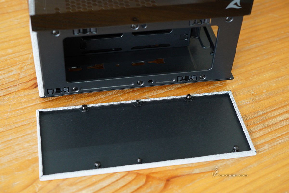 玻璃面板與下方蓋板可拆,玻璃採側邊釘釦式固定,不過內側有額外1顆螺絲,主要應該是避免不小心掉落。另外下方蓋板可拆,雖說拆了也不知道要幹嘛就是,但可以看到內部並不是網孔,雖說布質通風,但如果惹塵可能就不是那麼美觀,大概是這緣故並沒有把內部弄成通風孔。